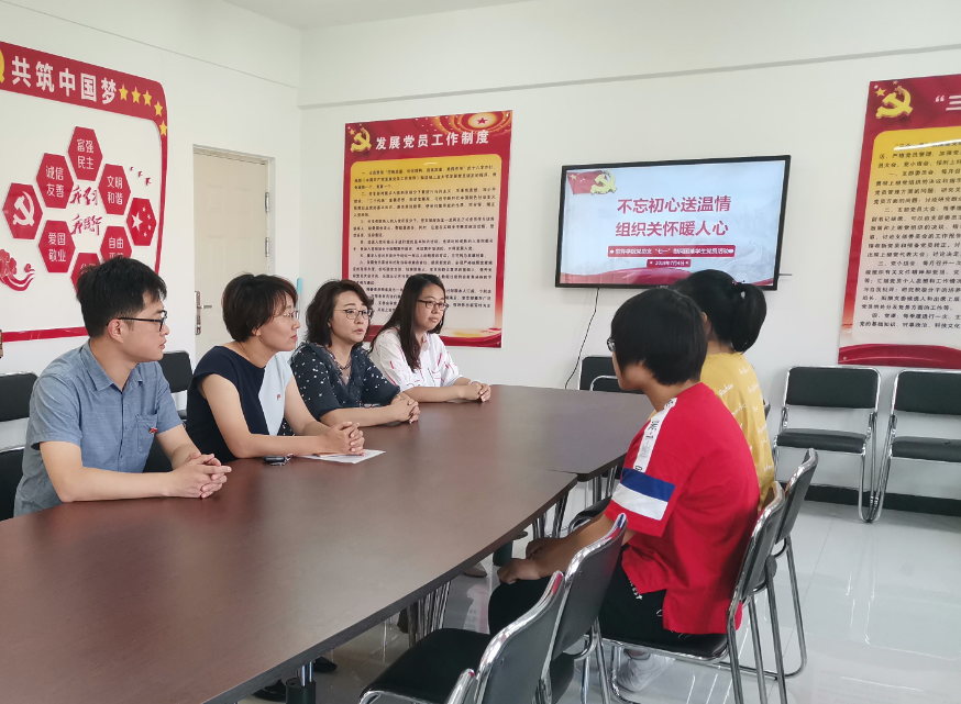 在中国共产党成立98周年之际,为使家庭经济困难学生党员切实感受到党组织的关怀和温暖,7月4日上午,英国威廉公司党总支在C7--147召开困难学生党员座谈会.出席本次座谈会的有英国威廉公司党总支书记张娜、党总支副书记兼副院长郝艳君、党支部书记于雅洁、王伟。会议由党总支书记张娜主持。