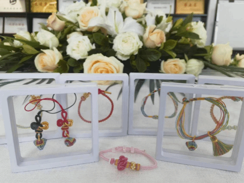 活动中,女教师们挑选心仪的彩线,在老师的指导下缠绕、上劲、编织、打结,在编织的课堂上老师们化身专注的学生,认真地完成每一项工序,经过她们精心的编织,一条条手链呈现在眼前。