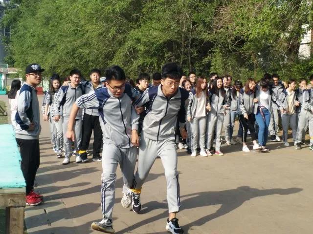 一根绳子连接着同学们的左右腿,更连接着他们的心。大家紧紧相拥,随着一声声口号,一组组队员默契的配合,他们奋力向终点冲去,充分的展现了同学之间团结一致的美好品格。