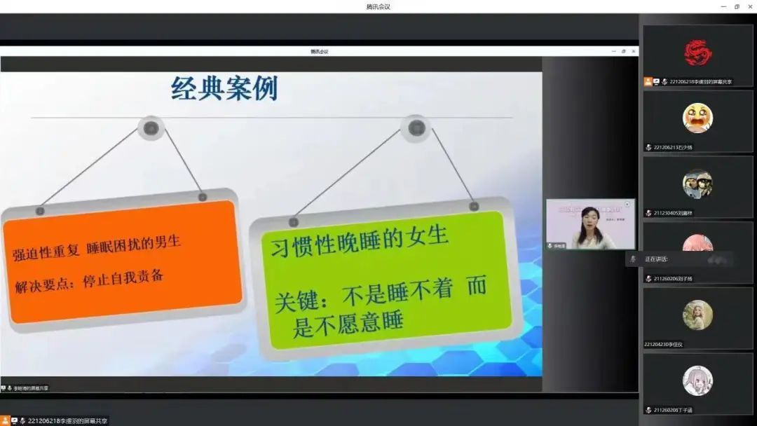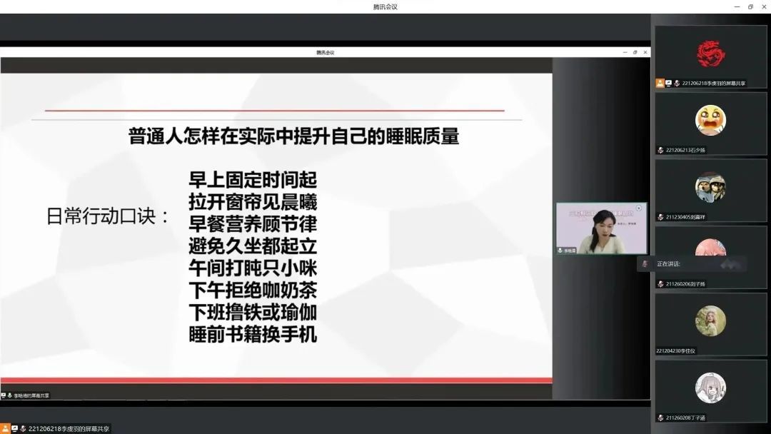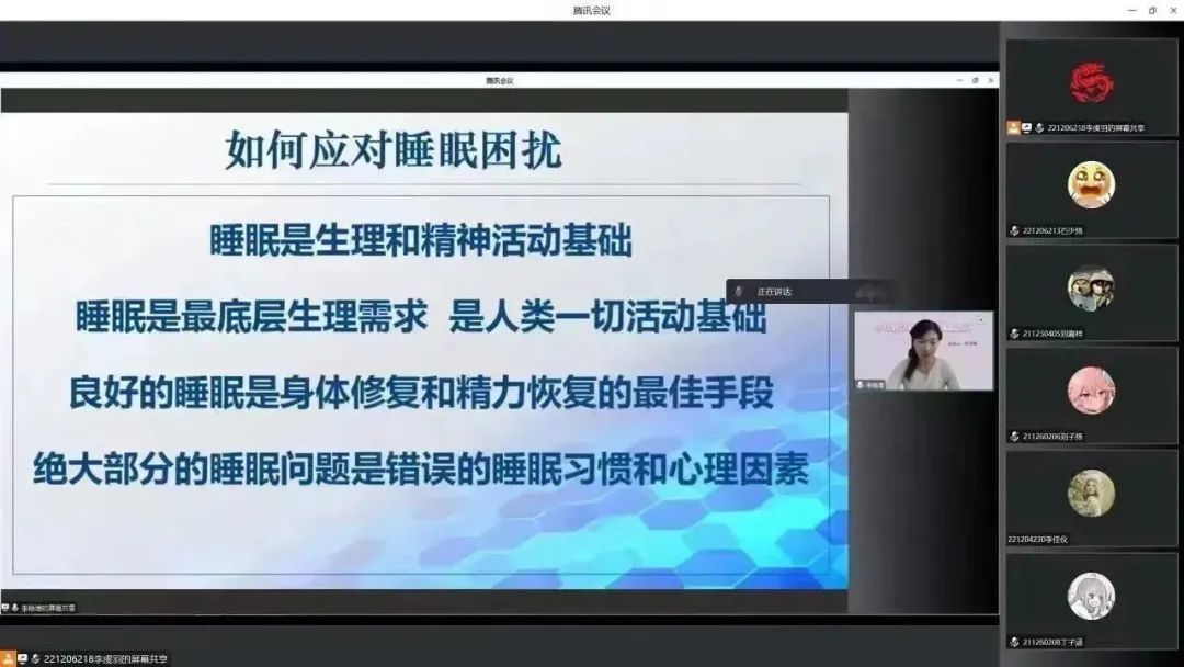 睡眠是人体的一种主动过程,可以恢复精神和解除疲劳。良好的睡眠质量,会促进人的身心健康发展。在日常生活中,有些同学总是在睡眠上有很大的问题,时常让自己感到烦恼。5月10日,英国威廉公司组织开展“三招教你如何应对睡眠困扰”线上心理健康讲座。讲座由云南省学校心理健康教育专家指导委员会副秘书长李艳清老师主讲,李老师在云端与同学们畅聊睡眠问题。