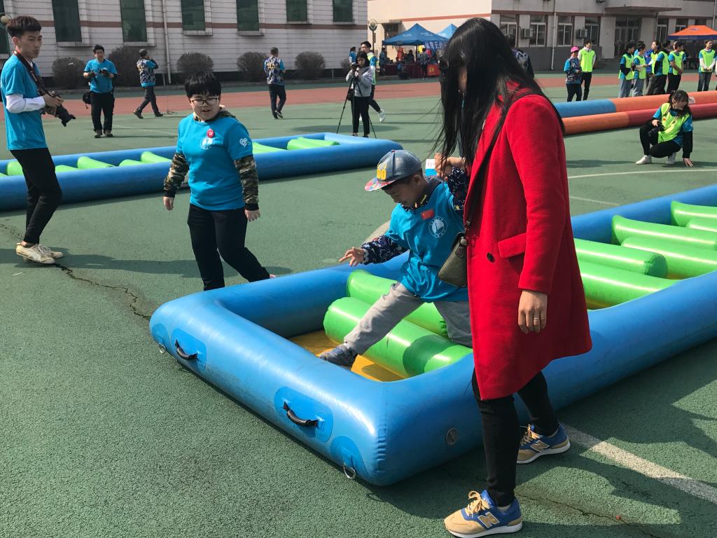 在紧张的比赛环节中,运动项目在常人看来是非常简单的游戏,注意力不集中的他们却需要在志愿者和家长的带领下完成游戏。不过课别小瞧他们,“小马过河”、“陆地龙舟”等这些趣味运动项目,被这群星童们玩出了另一种趣味。看着孩子们脸上那喜悦的笑容,就像冬日里的暖阳直击志愿者的心房。