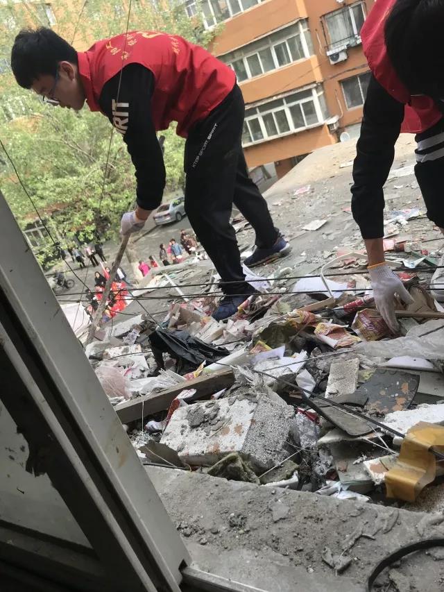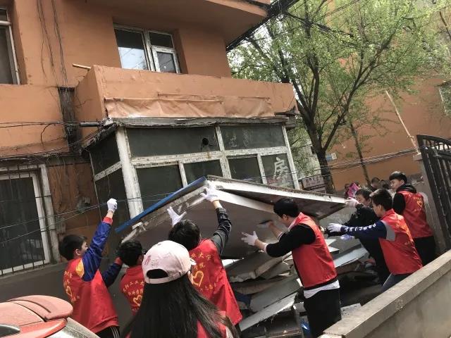 男同学不怕脏不怕累不畏高,齐心协力把楼顶上堆放的木门、门框、木板、泡沫板等杂物搬到楼下,并进行合理的处理。虽然天气有些闷热,志愿者早已大汗淋漓,但当看到社区居民为他们伸出的大拇指,大家都露出了无比开心的笑容。