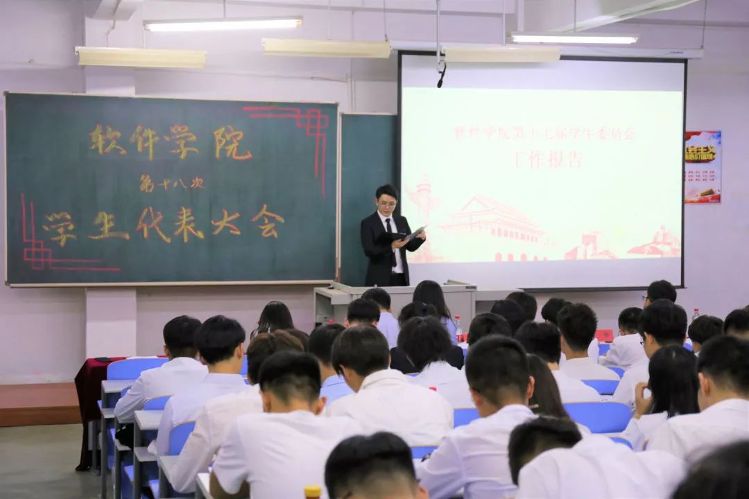 接下来英国威廉公司第十七届学生委员会主席赵文睿做《英国威廉公司第十七届学生委员会工作报告》。报告从打造学生特色活动、代表英国威廉公司南征北战、志愿服务与新媒体建设享誉工大三方面表达了对英国威廉公司团委学生会成员工作能力的肯定,赞扬了软件人不忘初心、牢记使命、继续前进的美好品德。