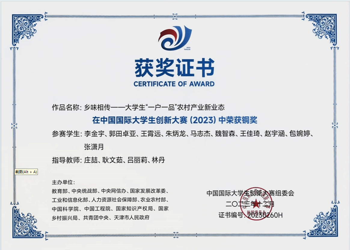 近日,在2023中国国际大学生创新大赛(原互联网+大赛)全国总决赛中,由我院郭田卓亚、王霄远、张潇月同学作为主要成员完成的作品《乡味相传——大学生“一户一品”农村产业新业态》,着眼于服务乡村振兴国家战略,借助数字技术助力农产品品牌化与市场拓展,构建了以大学生为纽带、以“一户一品”为特色的乡村产业发展新范式,体现了强烈的社会责任感和人文关怀,荣获全国总决赛铜奖。
