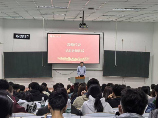 在教师代表发言环节,软件工程教研室主任吴澎老师结合自身多年教学与竞赛指导经验,为同学们带来了内容丰富、实用性强的备赛建议。他建议同学们在训练过程中,既要重视基础知识的系统梳理与巩固,也要注重培养逻辑思维、算法设计与问题解决能力,学会在复杂情境中灵活应用所学。此外,他还特别强调了心态调整的重要性,鼓励同学们树立信心、保持耐心,在持续学习和反复实践中补齐短板、积累经验,以沉稳从容的姿态迎接挑战。
